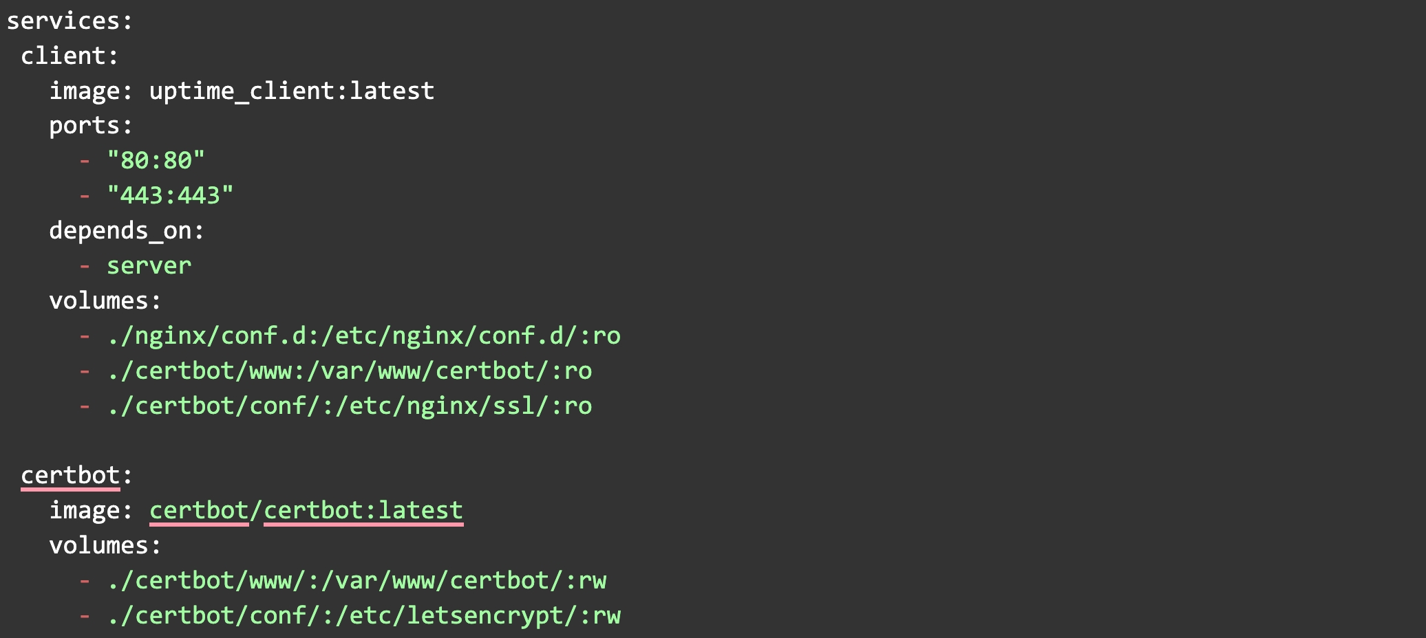 SSL is handled by LetsEncrypt and Certbot. This works by Nginx and Certbot sharing the same volume where the certificates are held. The following snippet from the docker-compose.yaml file shows how this works.
