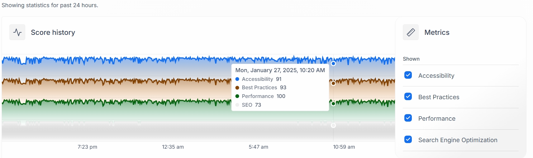 Shows performance trends over the past 24 hours. Four colored lines represent different metrics: