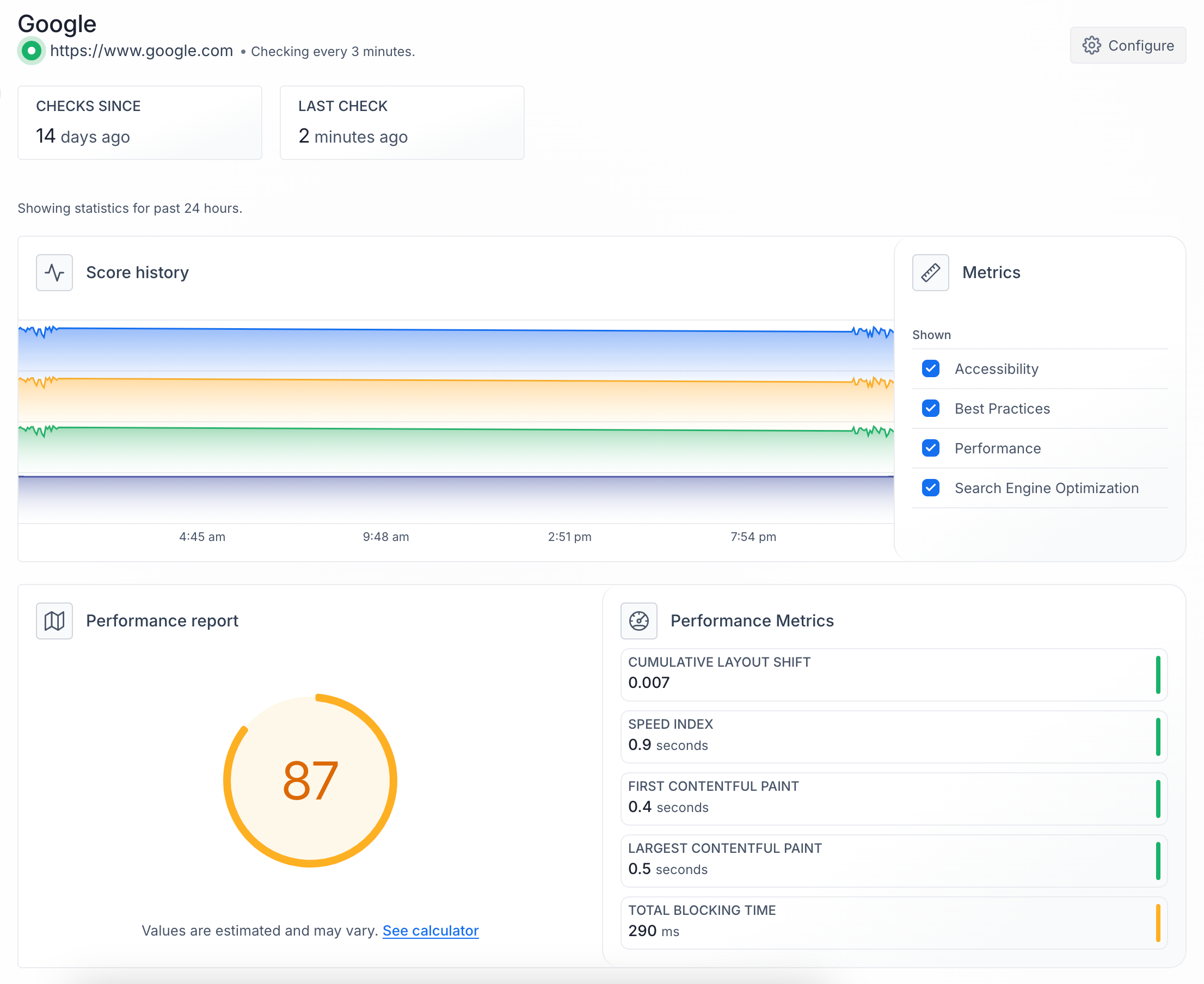 When you click on a pagespeed card, you'll see an overview of data collected using Google's PageSpeed Monitor API.