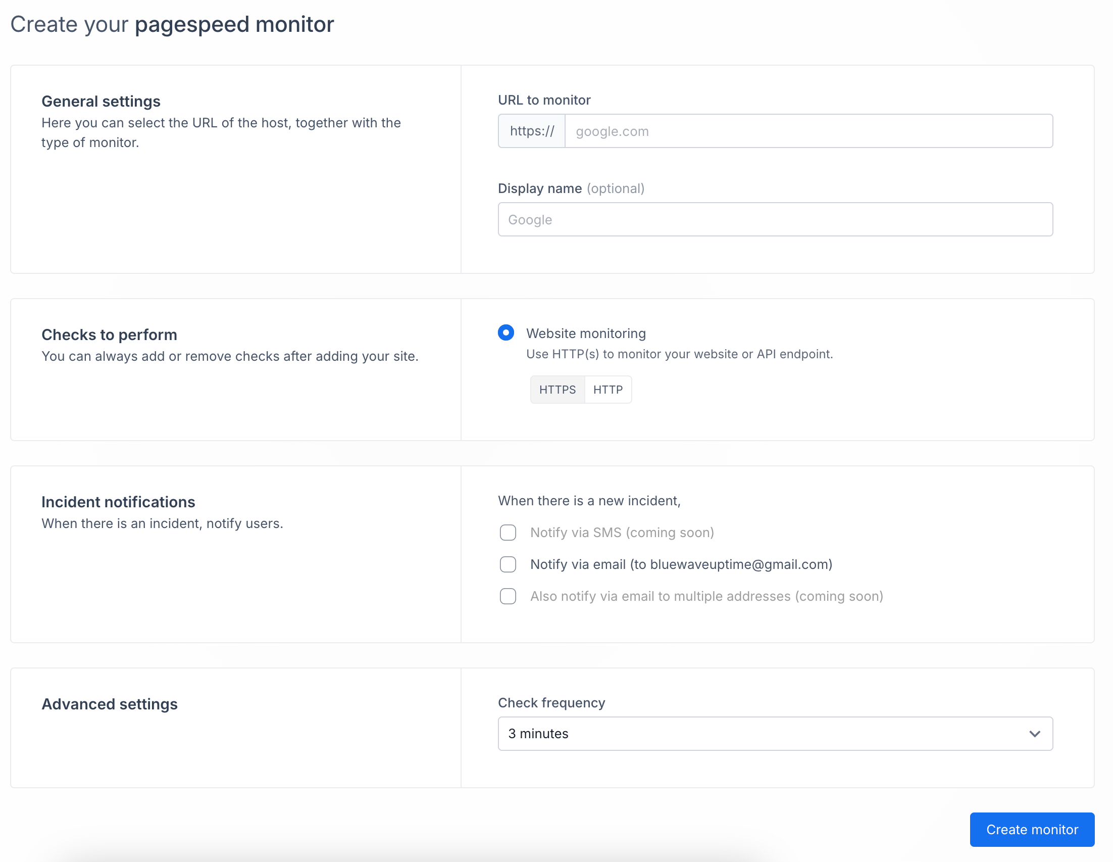 This page allows you to set up a new pagespeed monitor for your website. Follow these steps to configure your monitor: