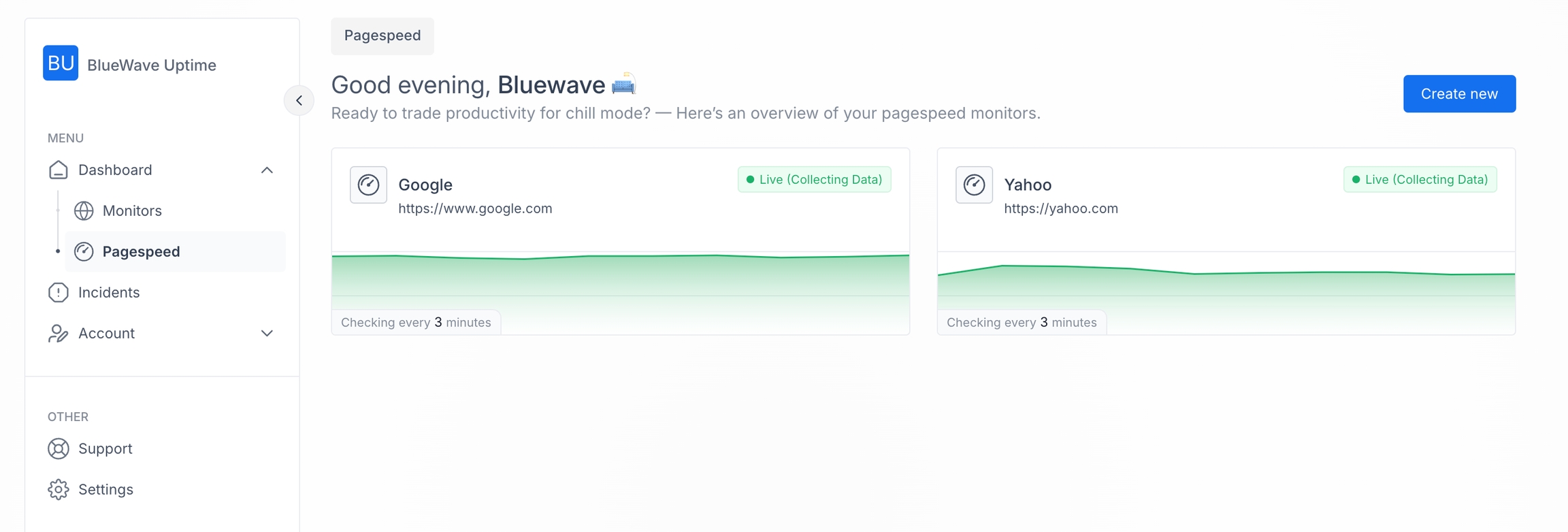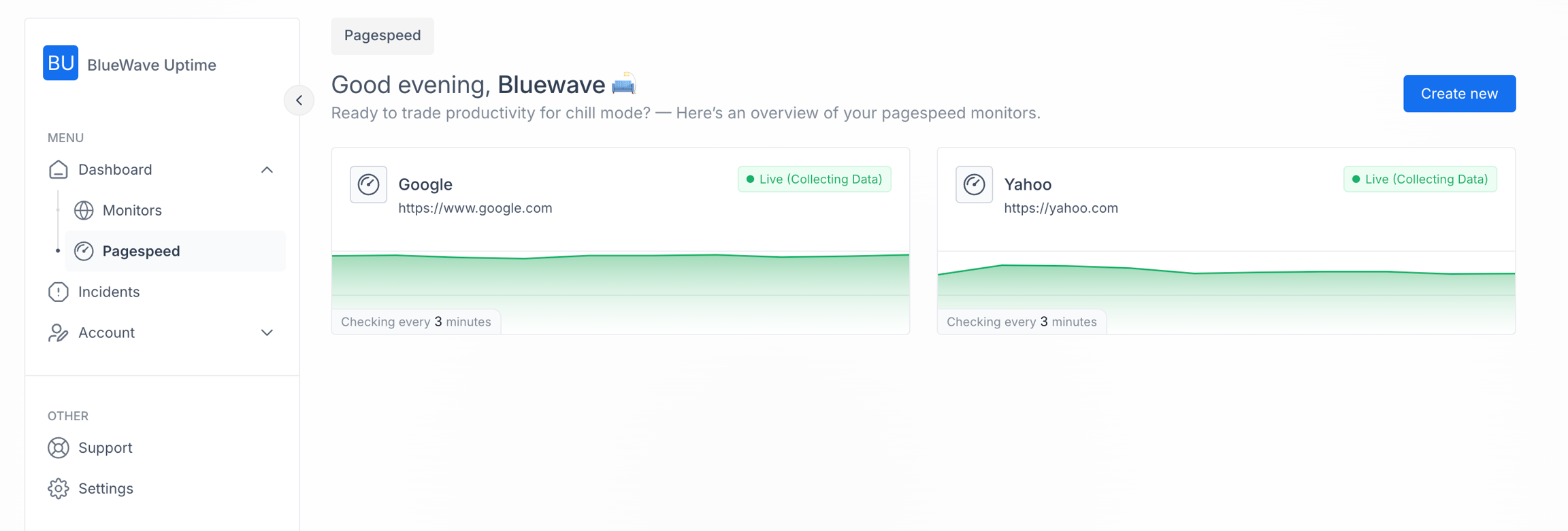 When you add a new page speed monitor, it is added here. Click on the "Create new" button to add a new page speed.