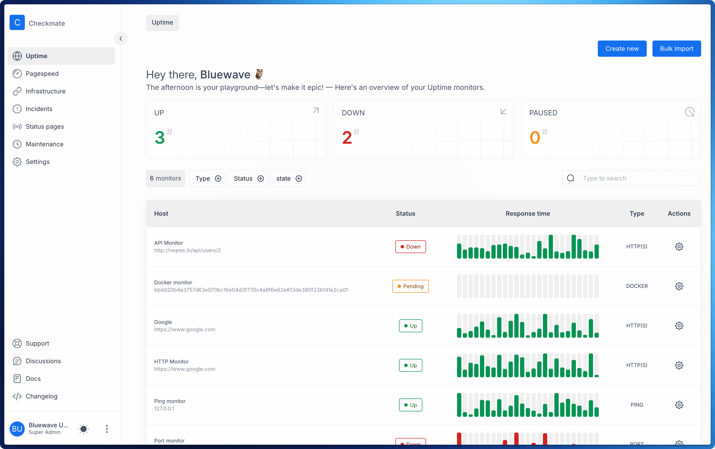 Checkmate is an open-source, self-hosted tool designed to track and monitor server hardware, uptime, response times, and incidents in real-time with beautiful visualizations.