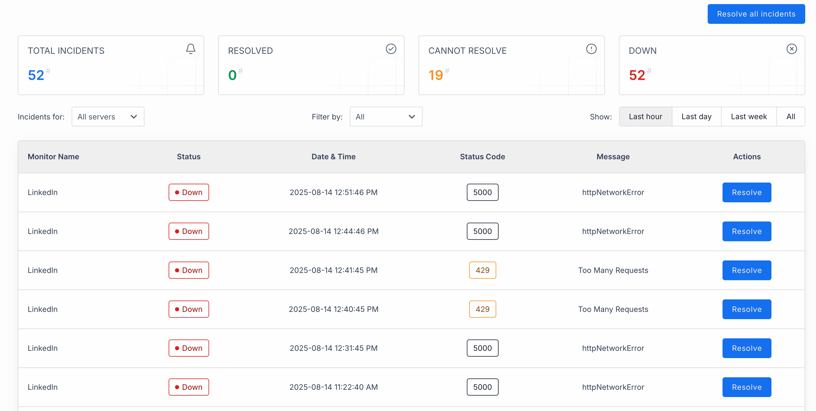 The “Resolve all incidents” button at the top will mark every incident in your current view as resolved in one go. This clears them from the active list and updates your resolved-count.&#x20;