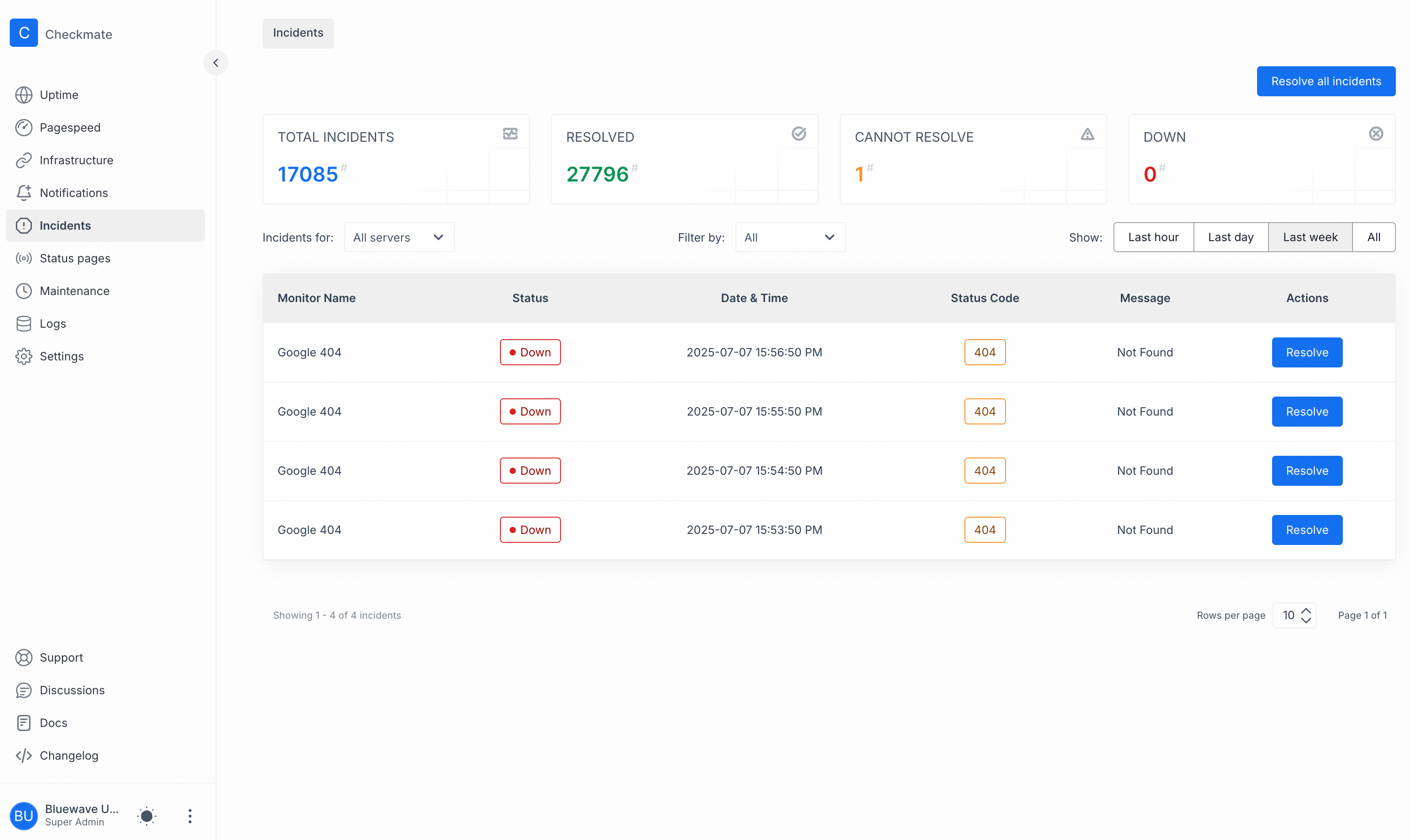 This page provides a comprehensive overview of all incidents across the servers you monitor. The incidents are displayed in a detailed table format, allowing you to quickly assess the status and details of each incident.