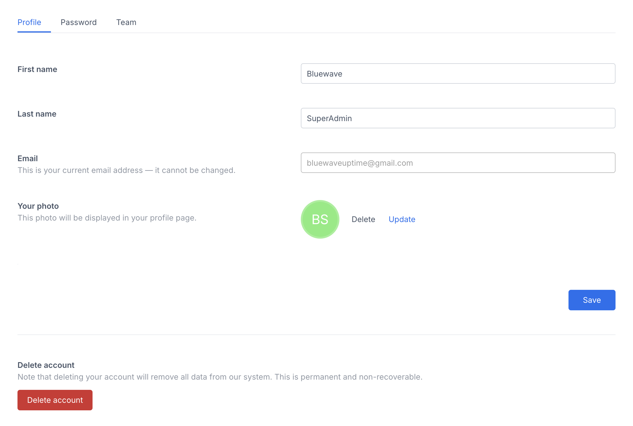 Enter your first name, last name and email here. You can also upload or delete a profile photo. If you want to delete an account, this can also be done here. Note that that this is irreversible and cannot be undone.
